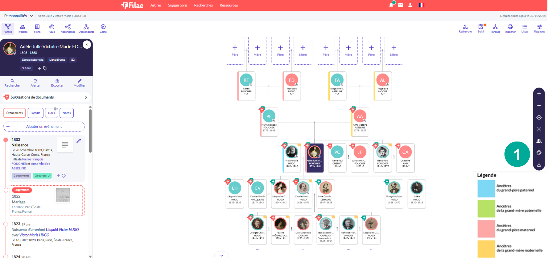Un trait coloré apparaît à gauche de la case pour chaque personne afin de repérer en un clin d’œil la branche par laquelle vous descendez de cet ancêtre.