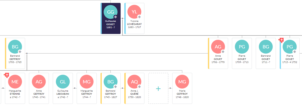 Le trait rouge renvoie vers des ancêtres déjà présents dans l'arbre. Dans l'exemple, Marie Gorin (1785-1870) est la fille de Joachim et de Louise Le Gall et la sœur de Louise Gorin. Il y a donc un implexe dans la généalogie de Marie A. Jaume ...