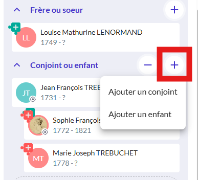 - Si des personnes n'existent pas, vous aurez des boutons comme + Ajouter le père, + Ajouter la mère, + Ajouter un frère ou une soeur, + Ajouter un conjoint, + Ajouter un enfant, + Ajouter une autre relation.