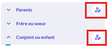 En cas d'erreurs de liens de parenté, cliquez à droite des parents et des conjoints et enfant sur l'icône de modification.