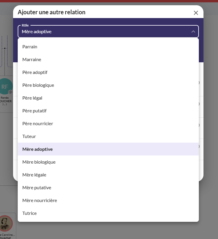 Dans le volet de saisie à gauche, cliquez sur le bouton Famille. Un écran s’affichera, vous permettant d’ajouter différentes relations :