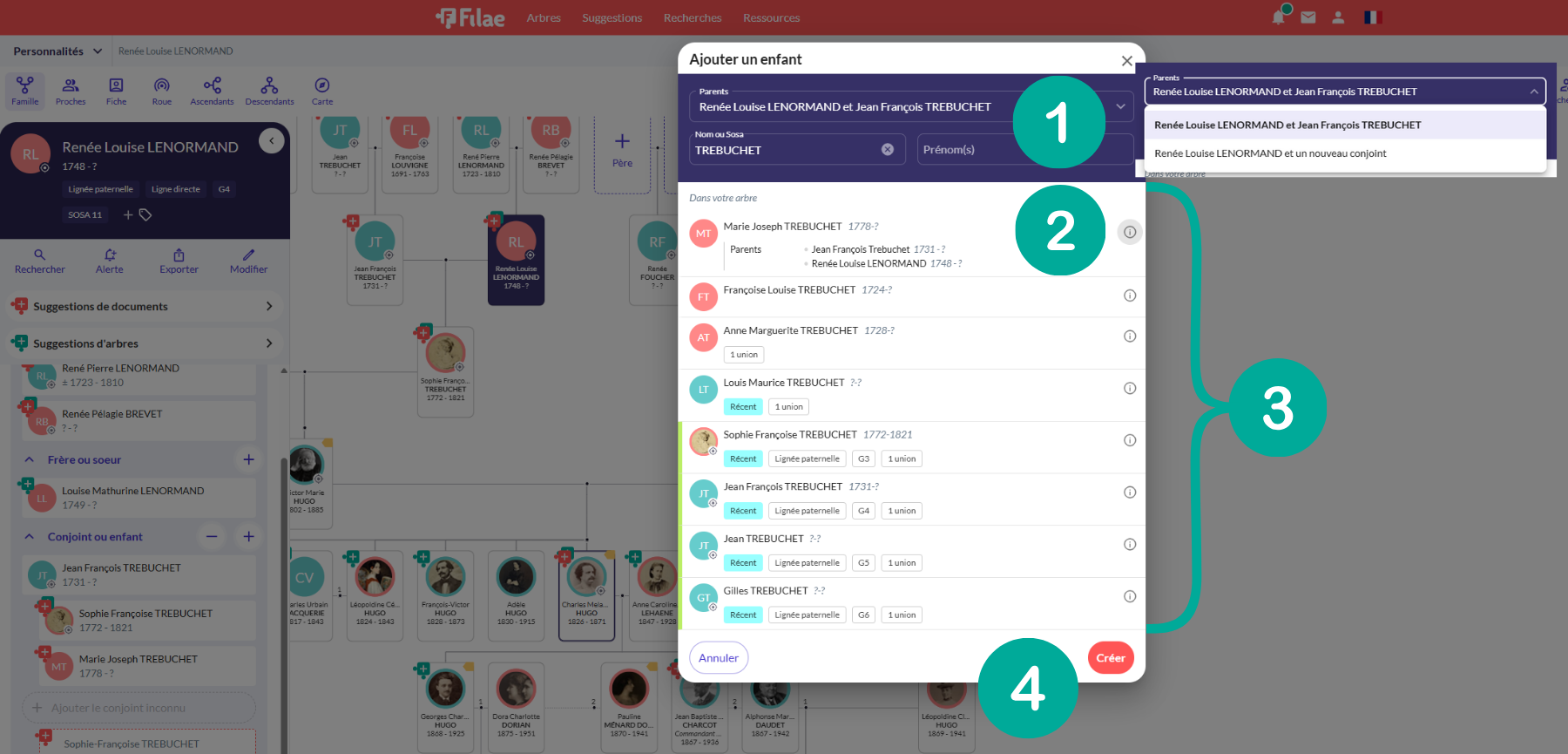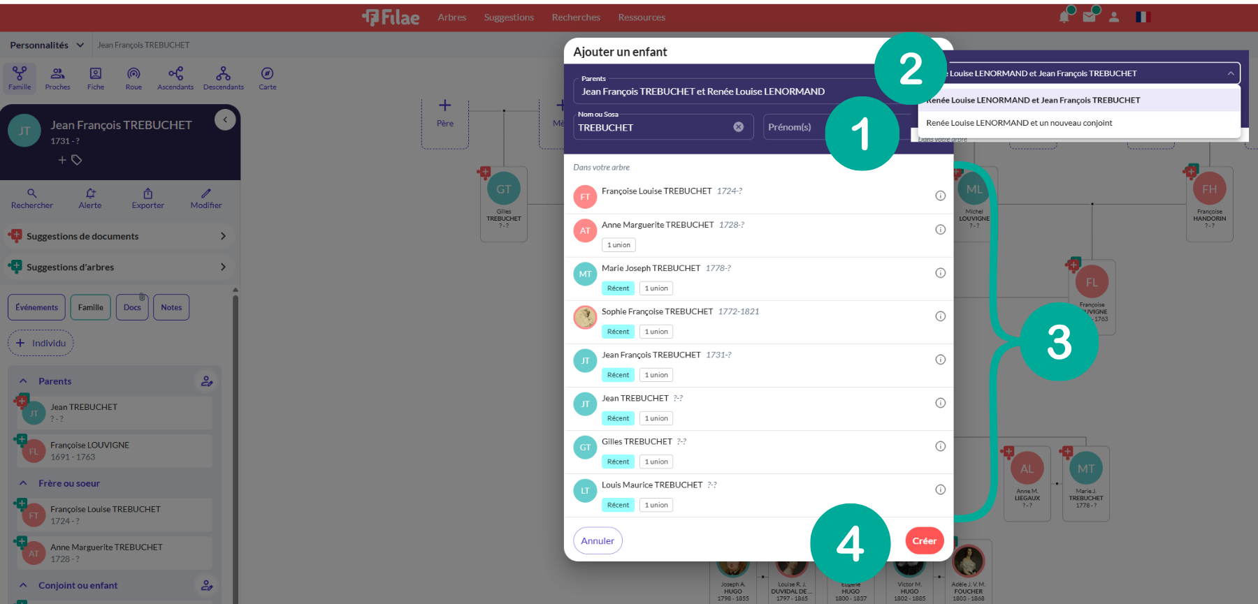 - Cette étape est importante car Filae vous indique si des homonymes existent déjà dans votre généalogie (3). Si la personne existe, il faudra cliquer sur la personne souhaitée (3)