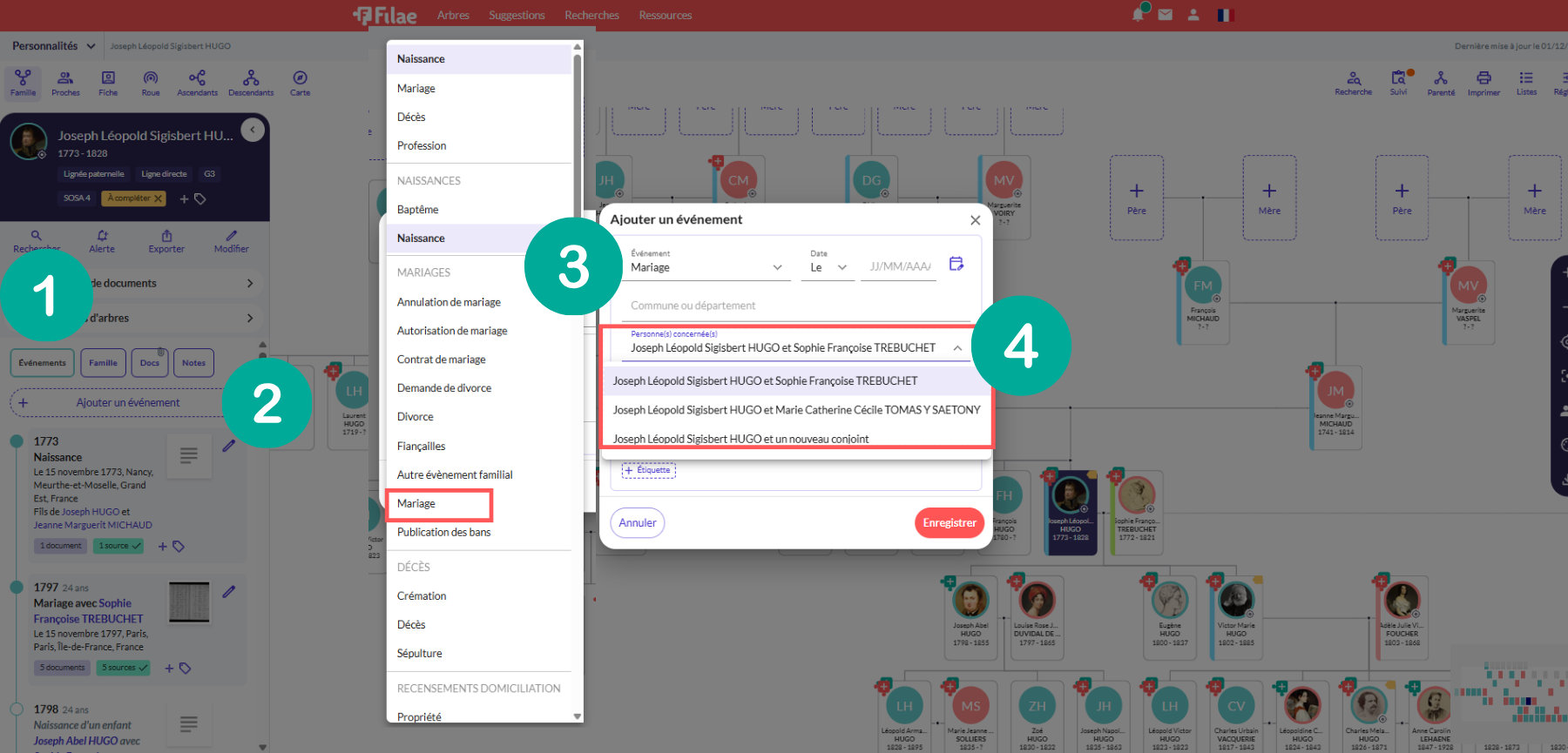 Vous souhaiter ajouter un divorce Cliquez sur la personne souhaitée. Cliquez le bouton Evénements (1) Cliquez sur le boutonv + Ajouter un événement (2) Cliquez dans Evénements afin d'ouvrir la liste déroulante (3) Cliquez sur Divorce (4) Saisissez ...