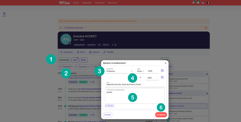 Vous avez une suggestion valide pour un individu de l'arbre et souhaitez l'enregistrer sur sa fiche ? Voici comment procéder : 1 - Accédez au document suggéré depuis la fiche de la personne, en cliquant sur l'icône corail Suggestion, ou sur l'aperçu ...