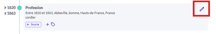 Vous pouvez donc saisir différentes professions si la personne en a exercé plusieurs au cours de sa vie. Il est donc possible de saisir la date afin de suivre la chronologie et un lieu pour suivre des éventuels déplacements.