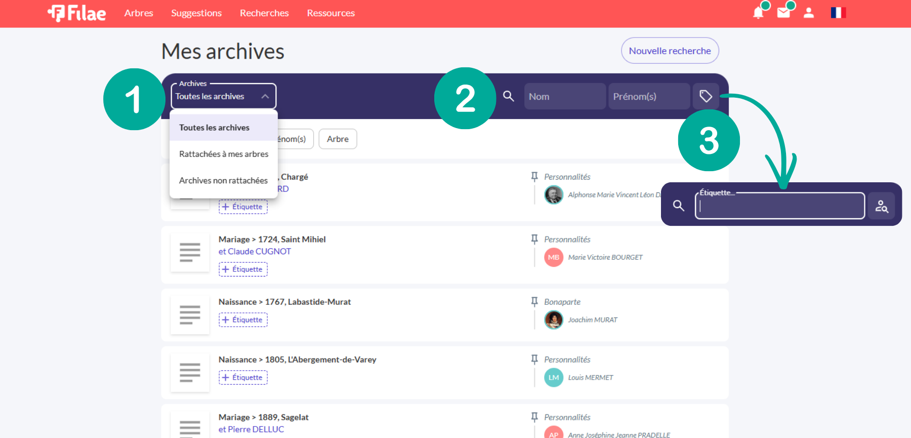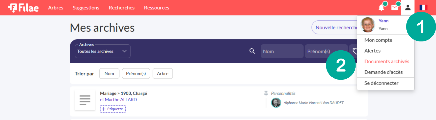 Par type d’archives : Distinguez en un clic les documents importés rattachés à votre arbre de ceux mis en favoris via le « cœur ». Cliquez sur Toutes les archives et choisissez Rattachées à mes arbres ou Archives non rattachées (1).
