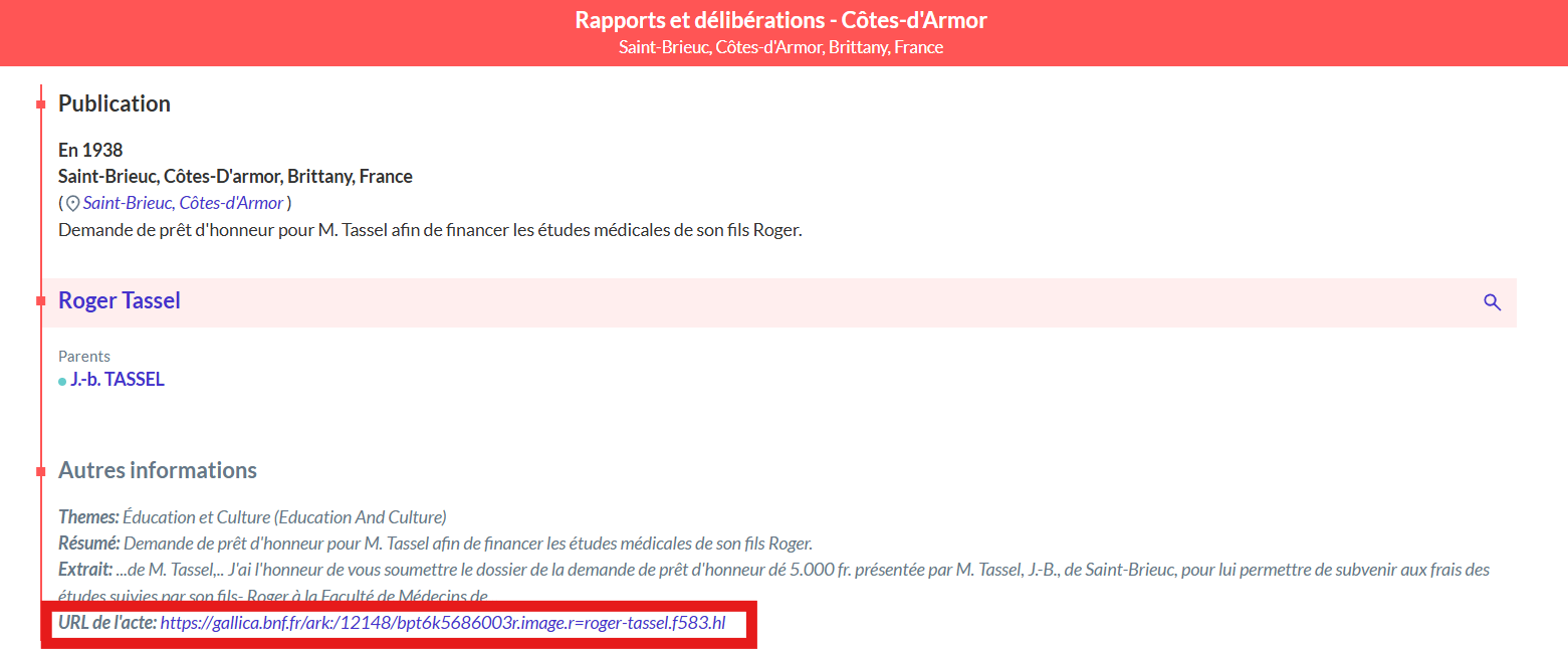 Pour consulter l'archive numérisée cliquez sur le lien situé au bas de la fiche (URL de l'acte). Vous serez automatiquement redirigé vers le site source (ici Gallica) pour visualiser le document numérisé.