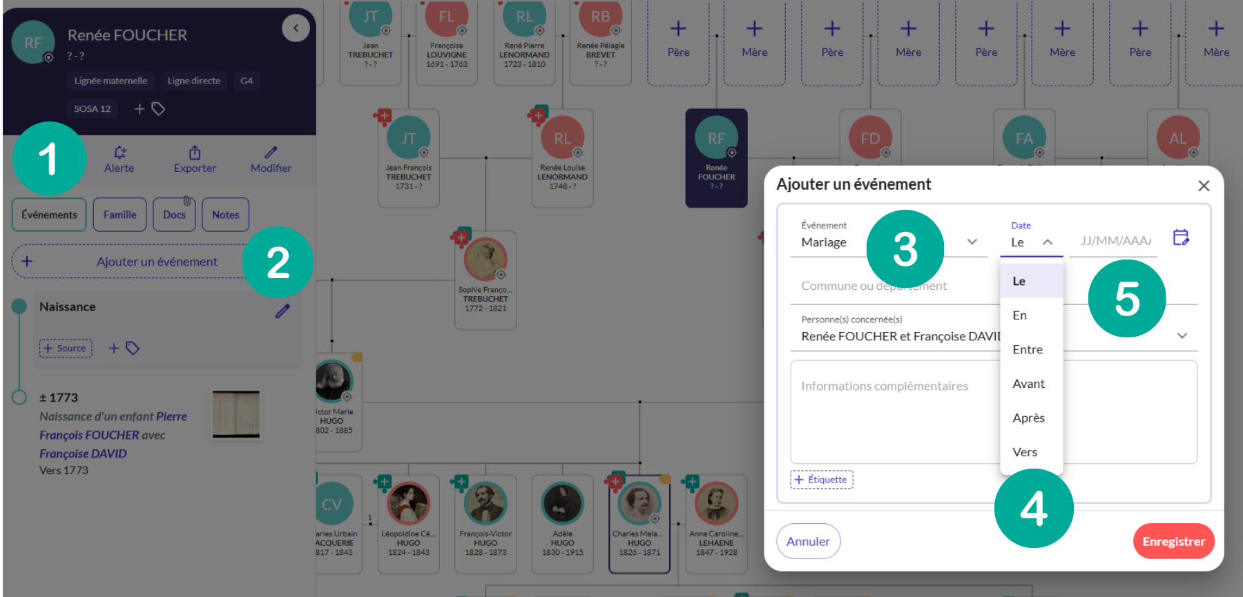 - Choisissez l'événement (mariage, décès, naissance...)