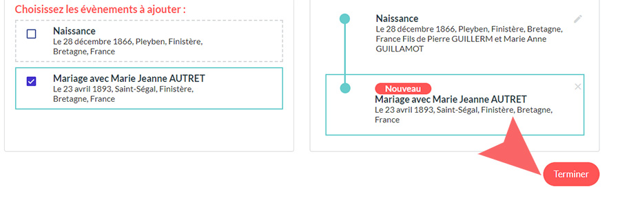 les événements manquants dans votre arbre. Glissez les nouvelles personnes à ajouter sur les cases avec