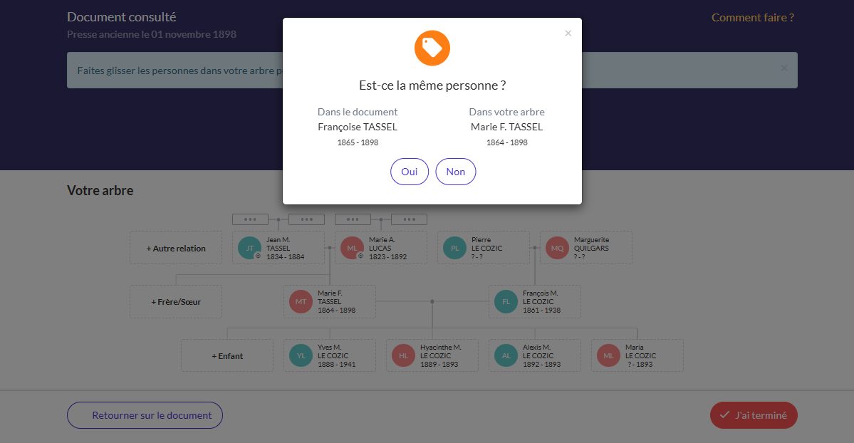 - Filae vous demande si c'est la même personne. Répondez oui ou non cela le cas