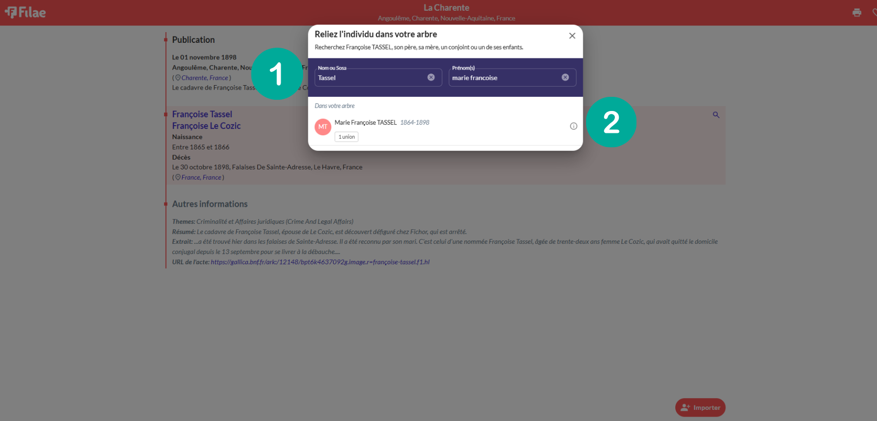 - Filae vous indique les homonymes. Cliquez sur la personne souhaitée. Cela peut être la personne concernée ou une personne proche.