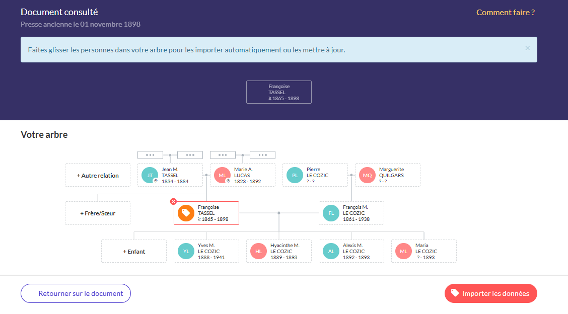 - Vous pouvez toujours cliquer sur la croix en cas d'erreurs et glissez la personne sur l'arbre en dessous. Par exemple, on pourrait avoir choisir une personne puis on ajoute un nouvel enfant, celui concerné par la publication