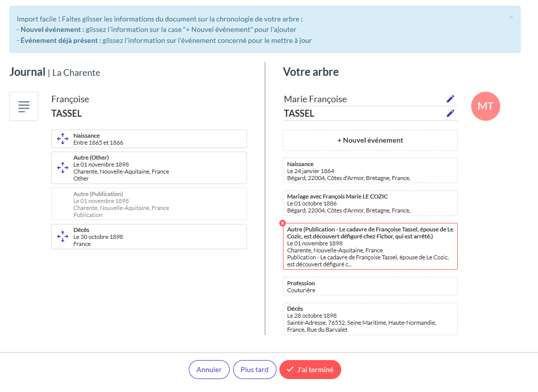 - Sur ce nouvel écran, on glisse les événements de la publication (gauche) soit sur un événement existant pour le mettre à jour soit sur + Nouvel Evénement pour en ajouter un autre. Il n'est pas obligatoire de tout importer. Nous avons une date exacte de naissance. On ne va donc pas mettre à jour la date de naissance approximative de la publication.