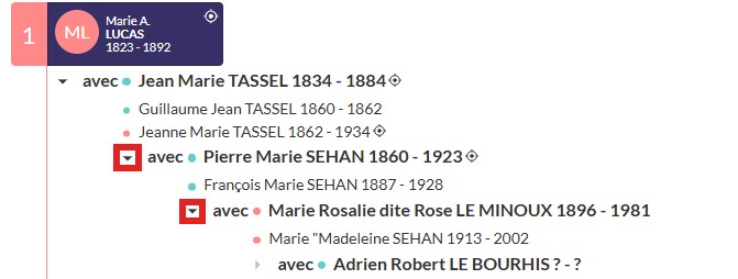 Il est possible de masquer une branche descendante en cliquant sur les triangles ou il est possiblle de développer les branches au delà de 4 générations en cliquant sur les triangles de son choix.