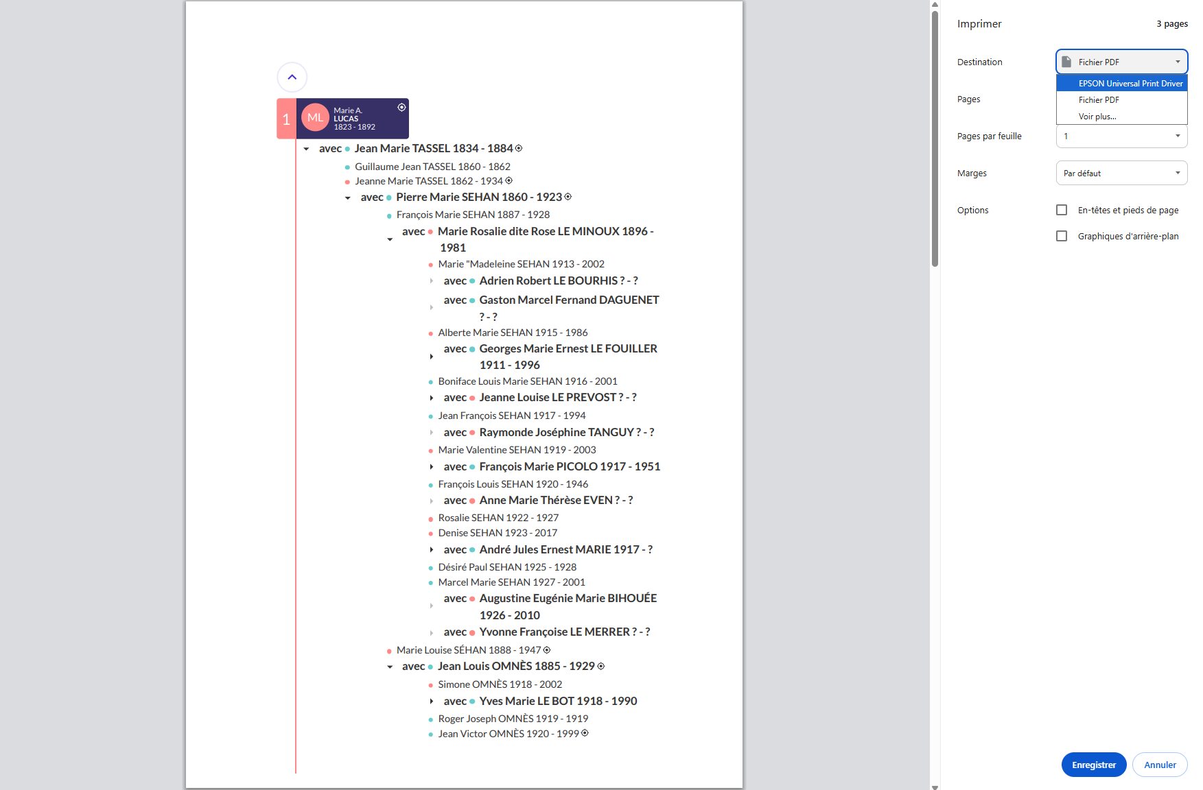 Pour imprimer sous forme de liste ou pour enregistrer en PDF la descendance d'une personne :