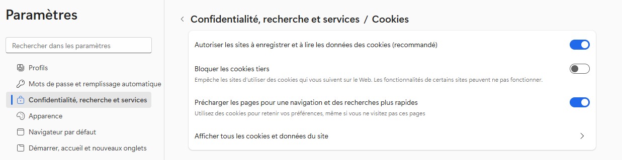 2) Allez dans Paramètres (accessible par les 3 points en haut à droite) puis Confidentialité, recherche et services et enfin Cookies.