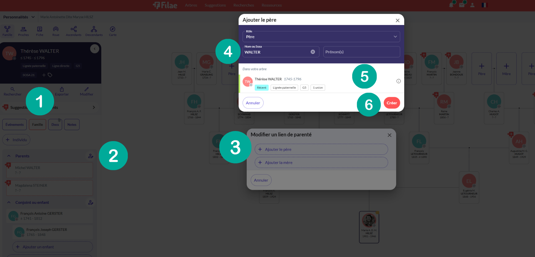- Filae affiche les homonymes, les personnes déjà présentes dans votre généalogie. Soit vous cliquez sur une personne existante (5) afin de la sélectionner soit vous cliquez sur le bouton Créer (6) afin d'ajouter un nouvel individu.
