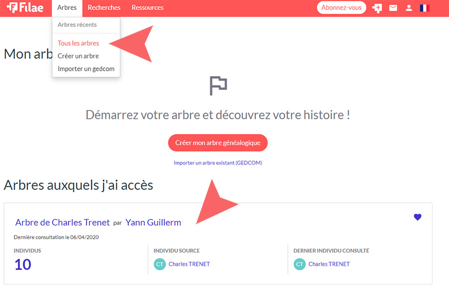 - Il n'a pas de compte sur Filae ? Il crée alors un compte gratuit et l'accès apparaîtra dans "Arbres auxquels j'ai accès" comme indiqué plus haut.