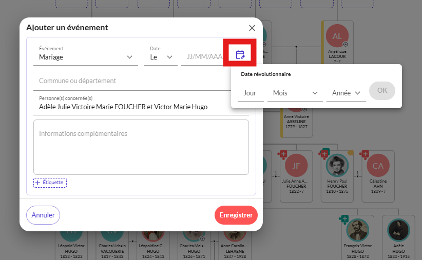 La date est automatiquement convertie et apparait en calendrier grégorien et révolutionnaire.